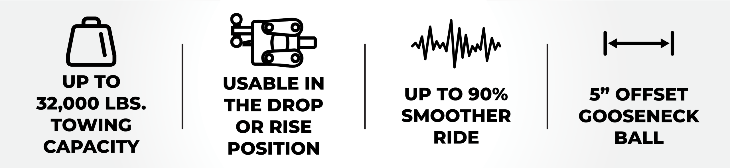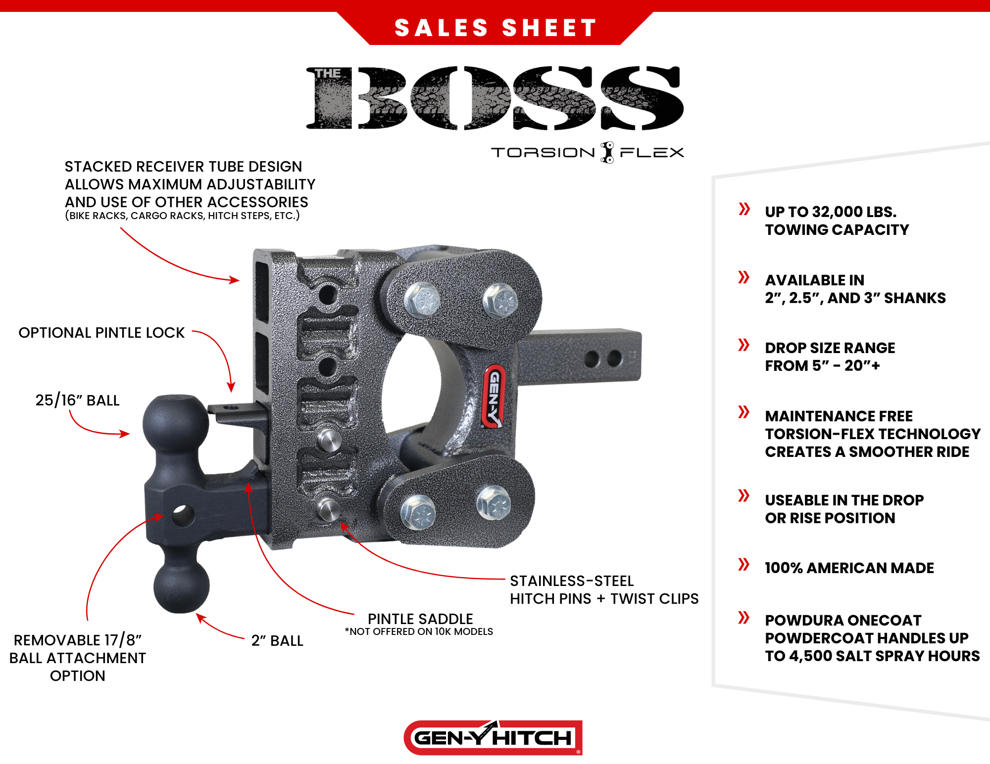 Hitches can include a dual-ball mount (2″ and 2 5⁄16″ balls) and a pintle lock attachment, making it ready to handle any trailer. Available in 2″, 2½”, and 3″ shanks and rated between 10,000 and 32,000 lbs, the BOSS combines American-made durability with the smoothest towing technology on the market. The TORSION-FLEX system is maintenance-free, giving you lasting performance without the hassle of upkeep.