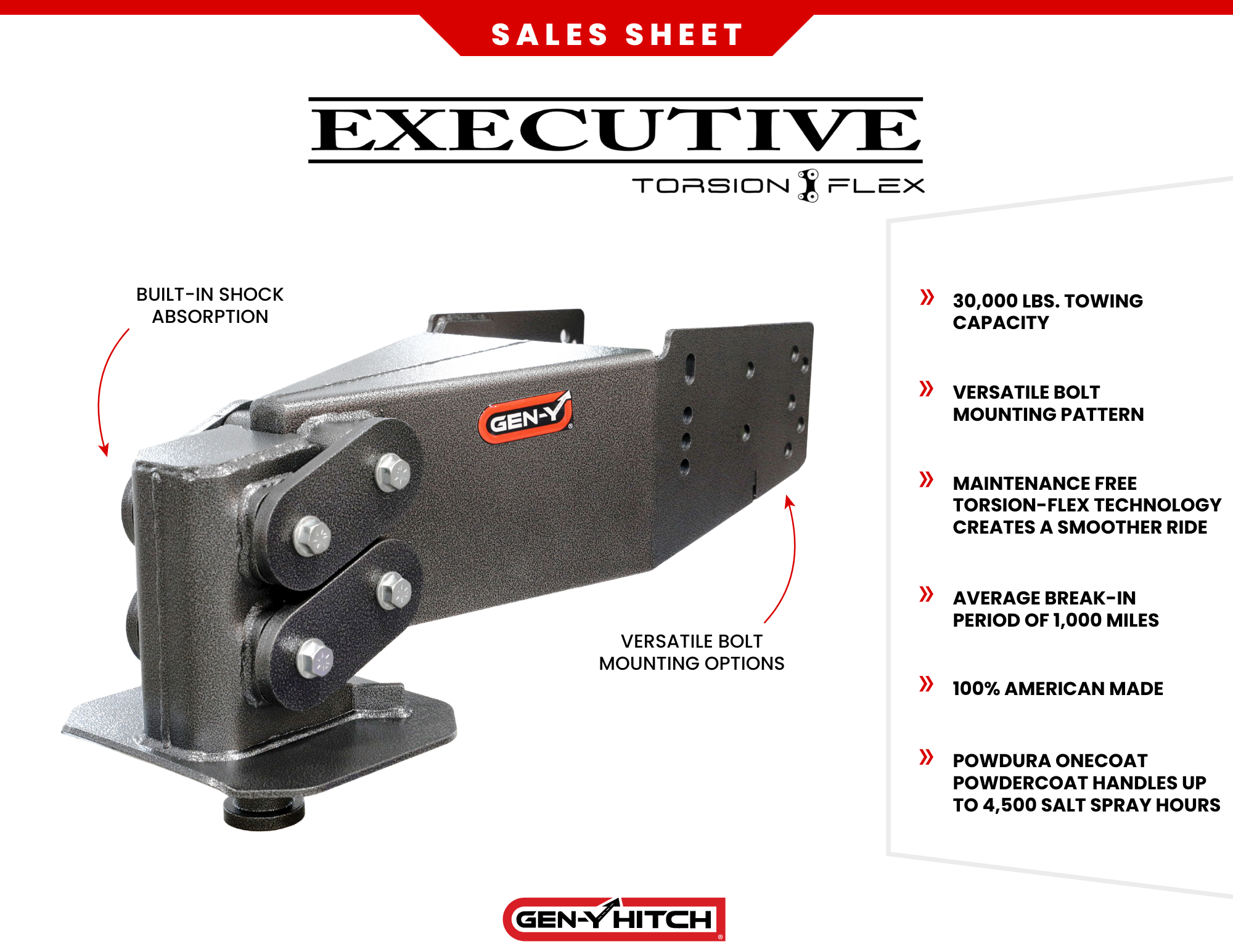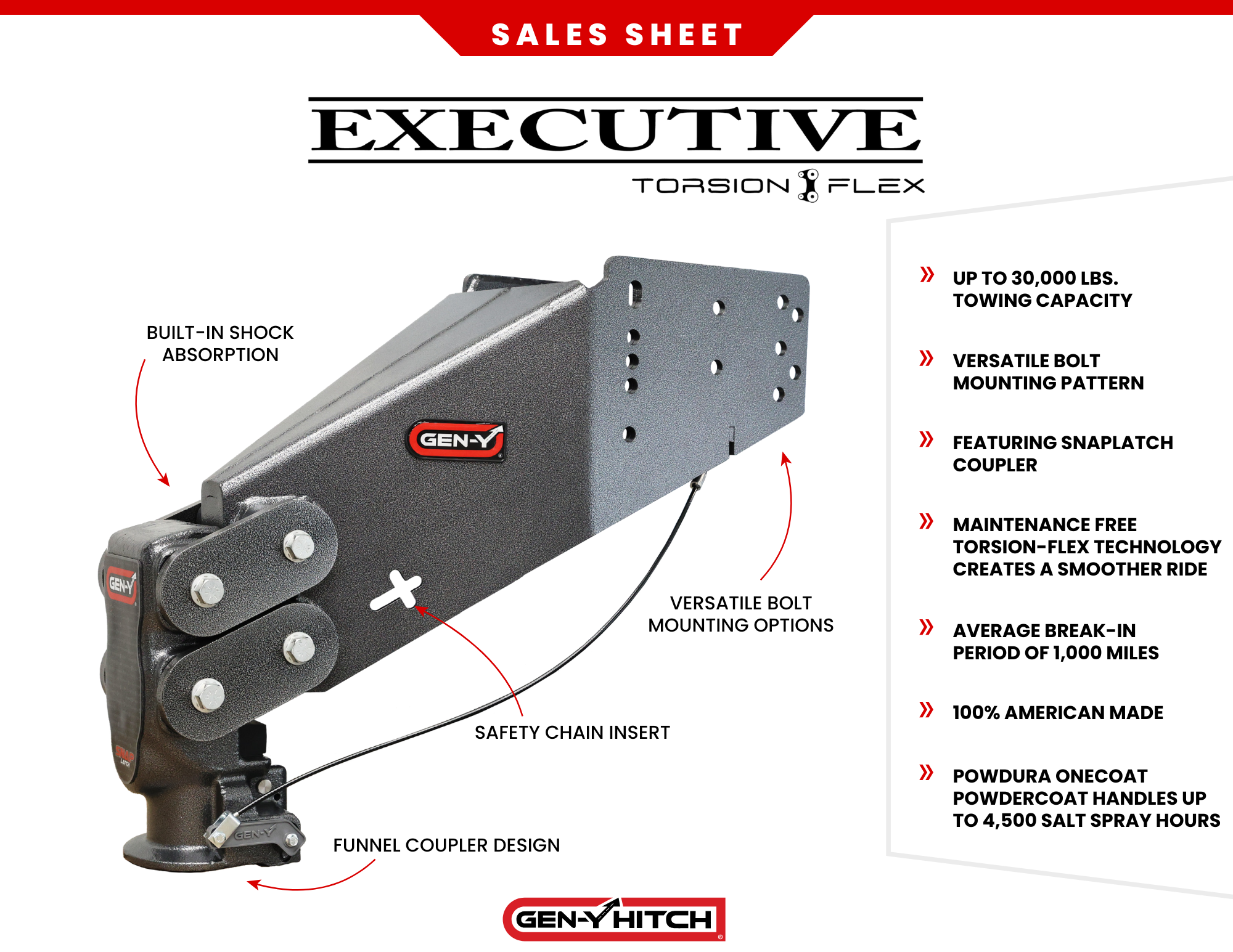 With a versatile mounting bolt pattern, the EXECUTIVE fits virtually any fifth wheel on the market. It’s available as either a classic king pin connection or the popular fifth wheel to gooseneck coupler. The fifth wheel to gooseneck model frees up space in your truck bed and features GEN-Y’s innovative SnapLatch coupler, which self-latches to ensure you are connected, safe and secure.