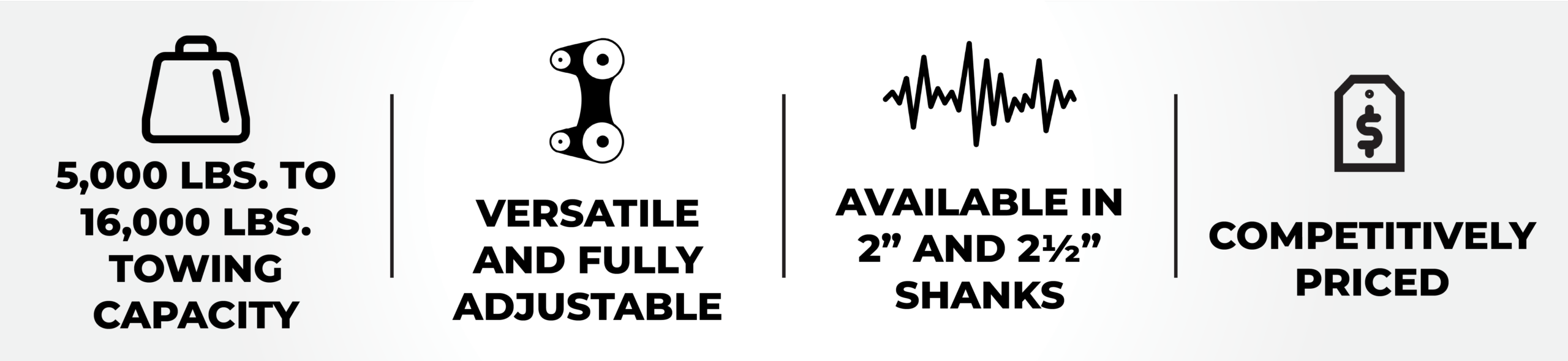 Available with 2″ and 2½” shank options and towing capacities from 5,000 to 16,000 lbs, the PHANTOM Series is durable, easy to adjust, and ready for everything from pulling a small trailer on the weekend to tackling medium-duty work all week long.