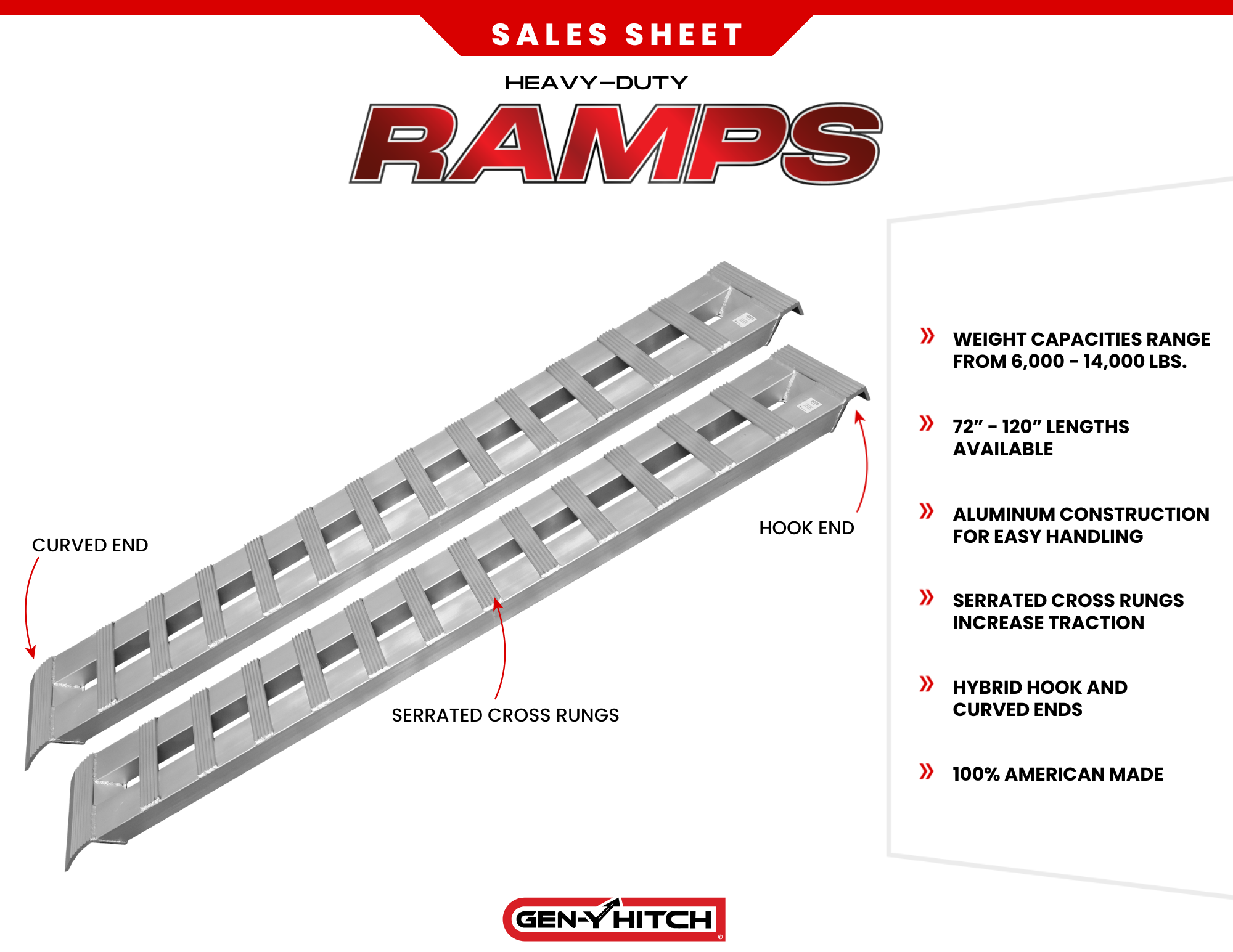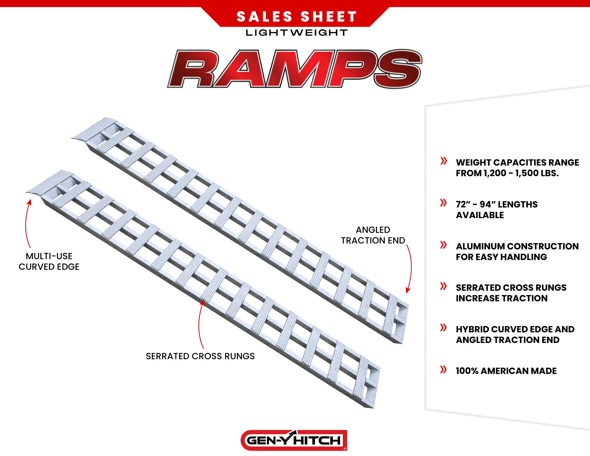 GEN-Y Aluminum Loading Ramps deliver heavy-duty strength in a lighter design that’s easier to handle than traditional steel ramps. Proudly made in the USA, they’re built tough to provide safe, versatile, and reliable loading.