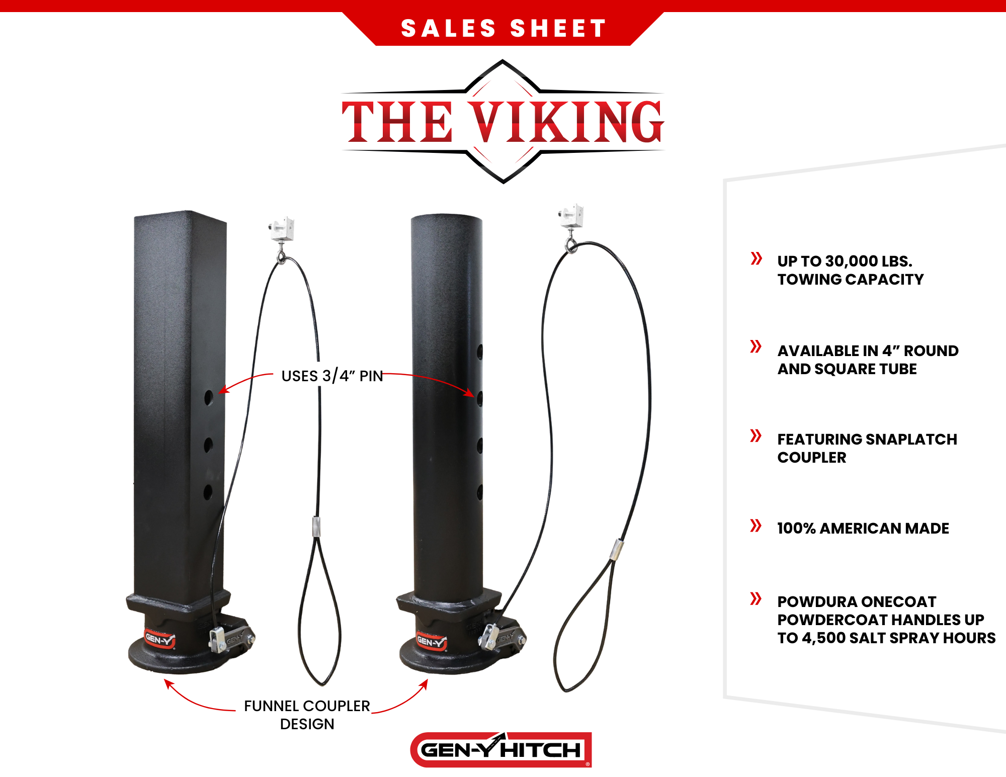 Available in both round and square tube options, the VIKING is rated for 30,000 lbs towing capacity with up to 8,500 lbs tongue weight, making it a dependable solution for heavy-duty towers.